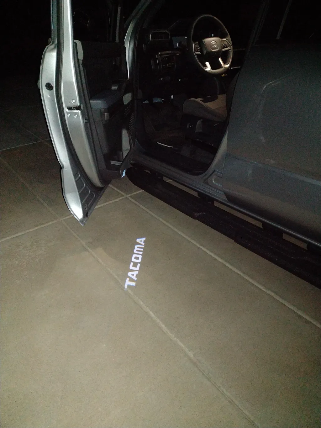 After installing the lights, I waited for the sun to go down, then opened the door of my truck. It was beautiful! Bright, sharp image on the ground that makes a statement for all to see!